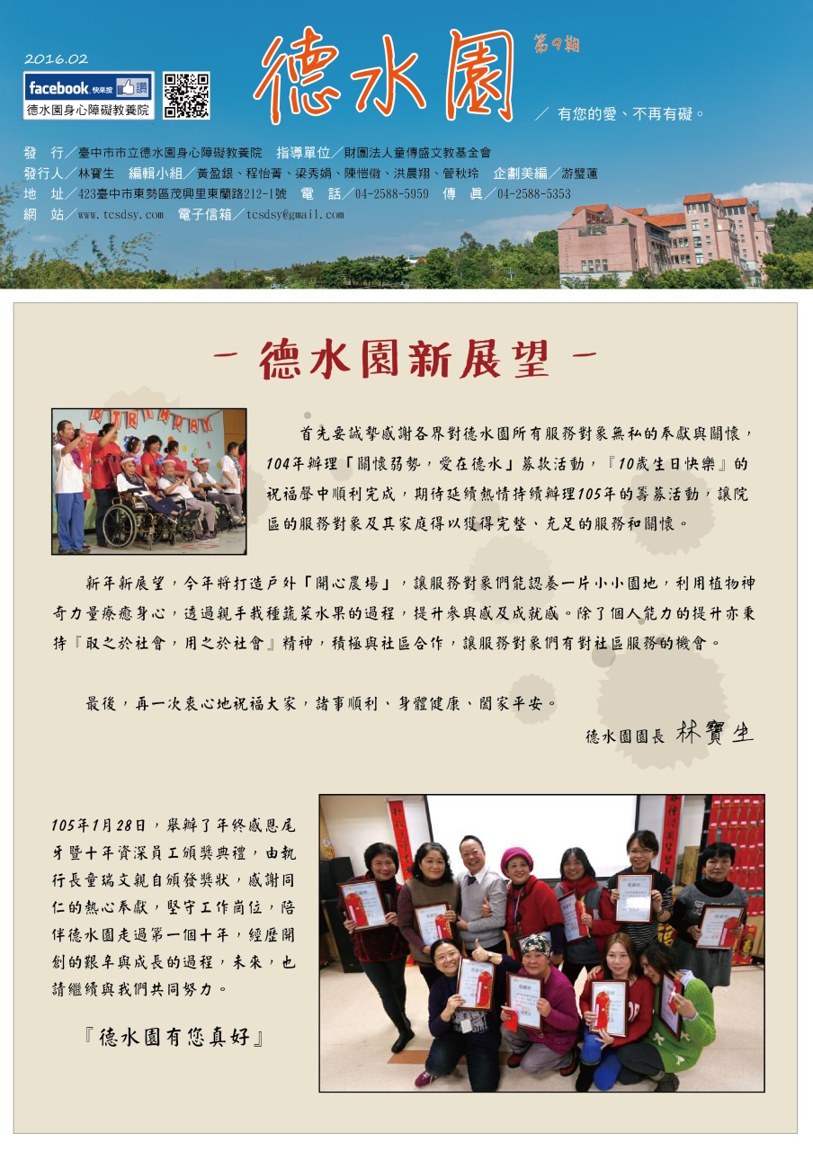 「德水園新展望」 誠摯感謝各界對德水園所有服務對象無私的奉獻與關懷,104年辦理「關懷弱勢,愛在德水」募款活動,『10歲生日快樂』的祝福聲中順利完成。除了個人能力的提升亦秉持『取之於社會,用之於社會』精神,積極與社區合作,讓服務對象們有對社區服務的機會。 「有愛無礙、真情之旅」 麗寶樂園一日遊」 4感謝台中市有愛無礙關懷協會主辦,臺中市政府社會局指導,105年1月7日星期四,免費招待德水園及各弱勢團體前往麗寶樂園遊玩。