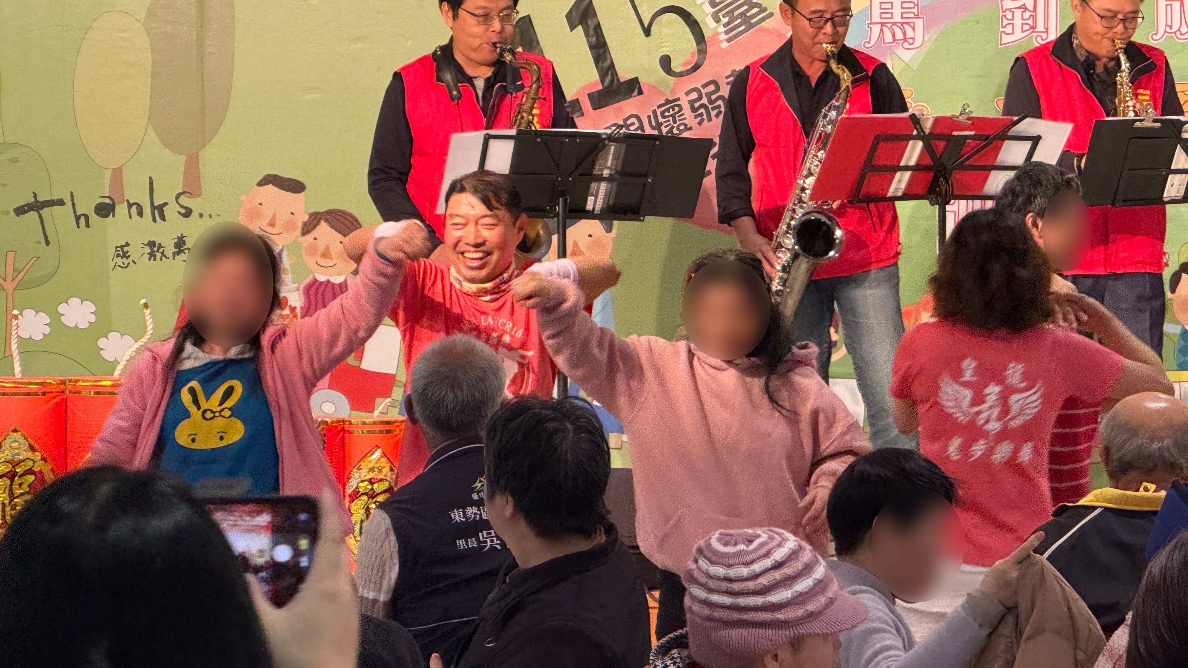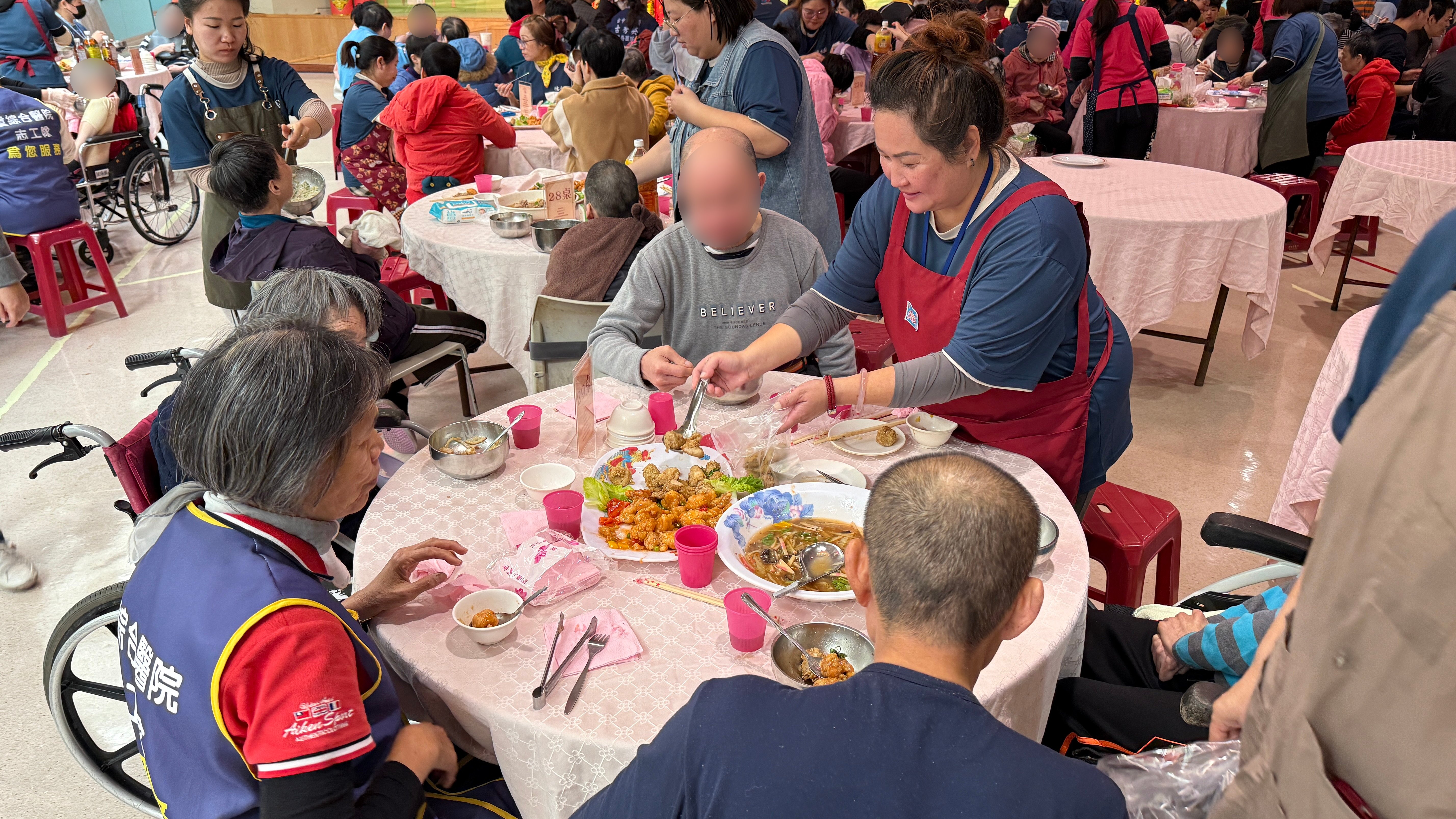 活動開始前,由薩克斯風演奏進行暖場,透過〈快樂的出帆〉、〈小蘋果〉等輕快活潑的曲目,帶動現場歡樂氣氛;隨後由皇龍鬼步樂舞帶來精彩的廣場舞表演,充滿活力的演出也讓服務對象隨著音樂一同舞動。開場後社會局副局長廖宗侯致詞,祝福活動圓滿順利,並向大家送上來年平安吉祥的祝福。活動中特別安排由多位長官與貴賓輪流進行摸彩抽獎,讓服務對象在品嘗豐盛年菜的同時,也專注聆聽長官唱名,現場歡呼聲與笑聲此起彼落,氣氛熱絡。